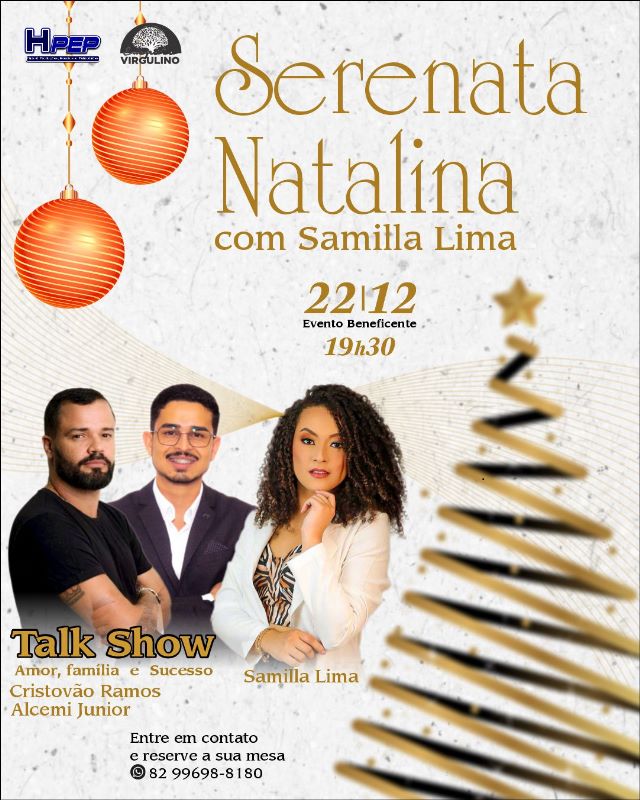 É a Serenata Natalina, em sua 1ª edição, que contará com show musical da cantora alagoana Samilla Lima, a partir das 19h30, além de um talk show especial com os empresários Alcemi Júnior (ESC Desenvolvimento) e Cristóvão Ramos (Confraria San Juan), com o tema “Amor, Família e Sucesso”.