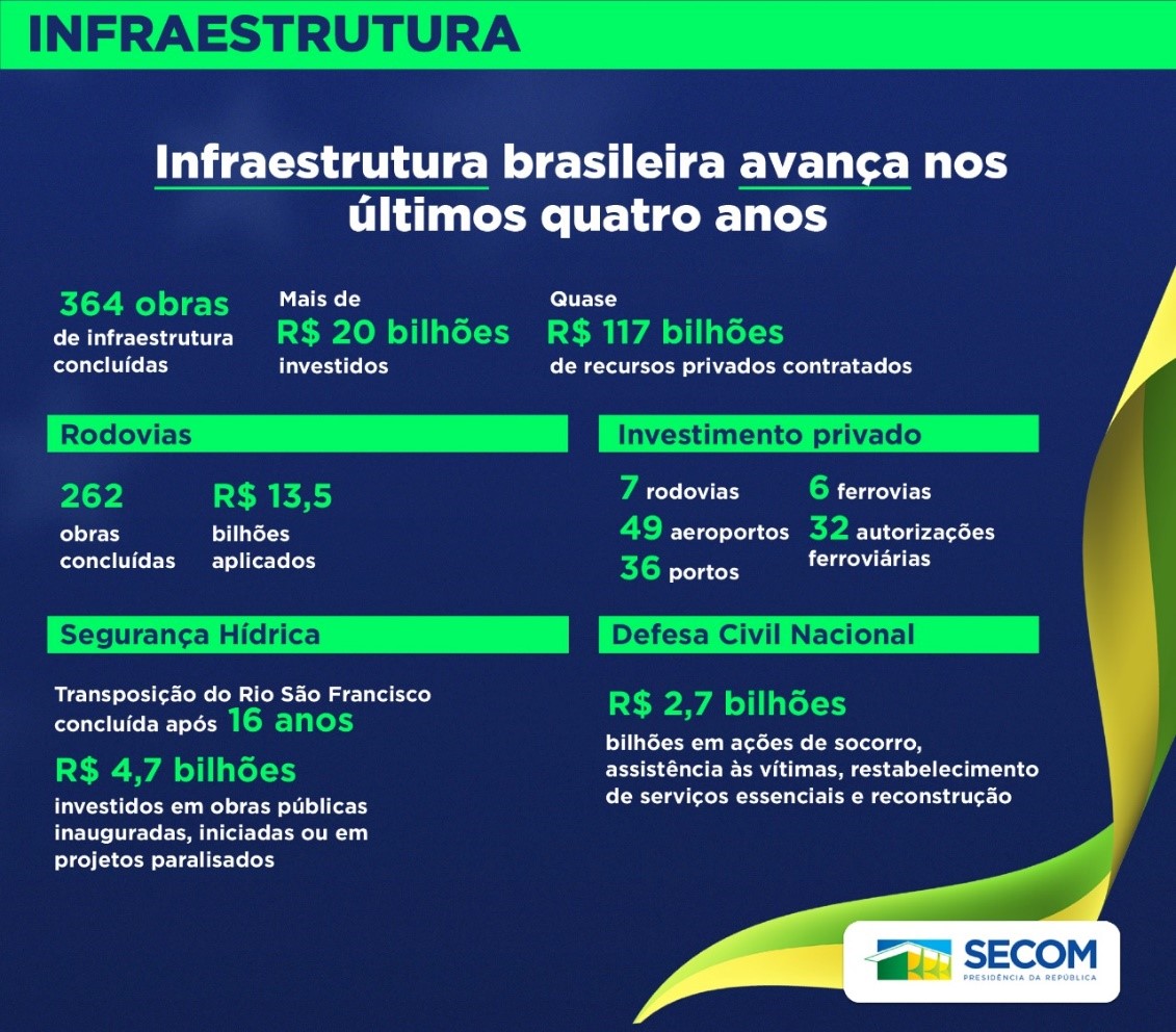 Um total de 364 empreendimentos de infraestrutura foram concluídos no país e entregues à população entre janeiro de 2019 e dezembro de 2022. Realizadas em todas as regiões do Brasil, essas intervenções representam mais de R$ 20 bilhões em investimentos, que se somam aos quase R$ 117 bilhões de recursos privados contratados após 100 ativos do setor serem concedidos no período pelo Governo Federal.