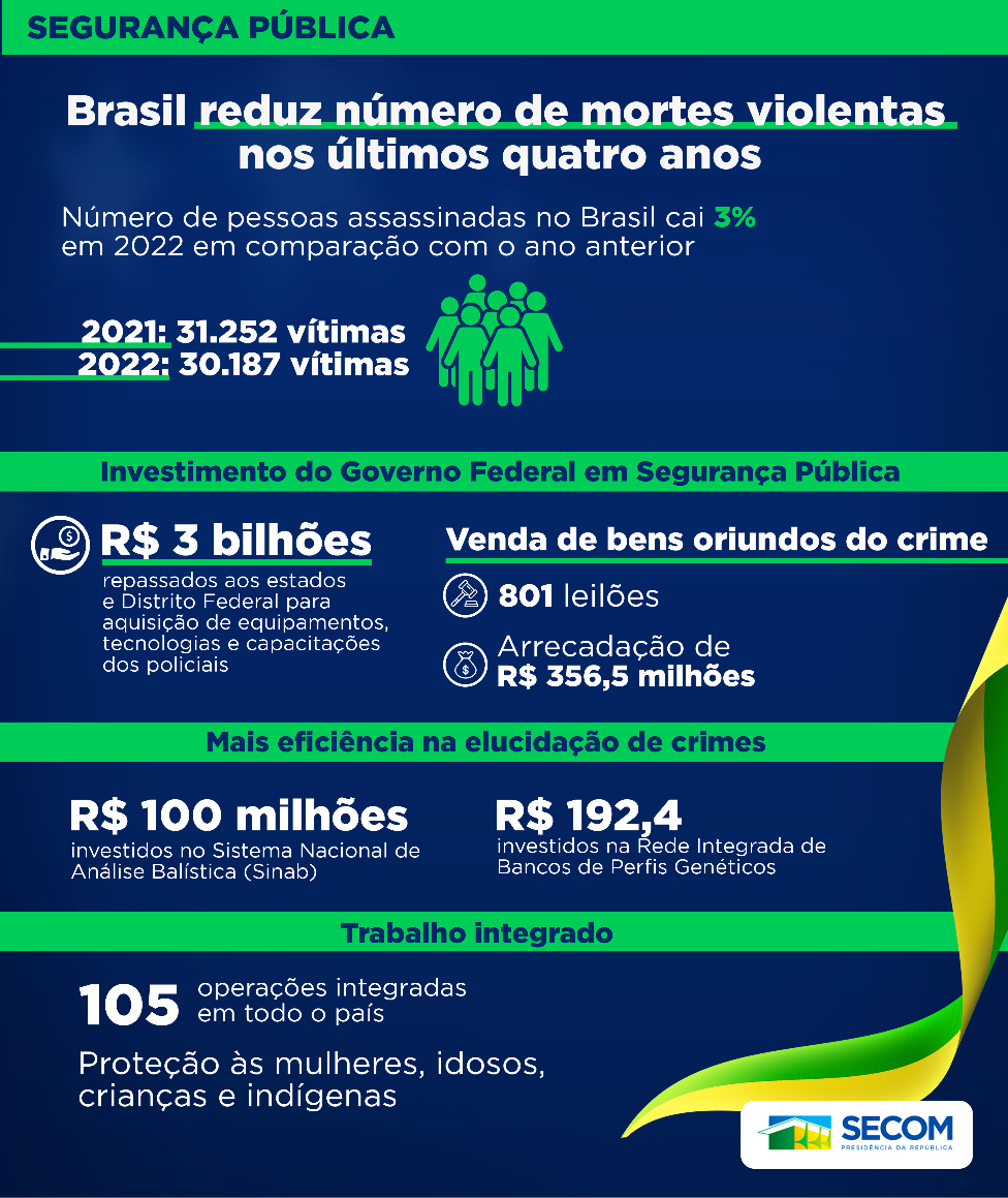 O número de mortes violentas no Brasil alcançou, em 2022, o menor patamar dos últimos quinze anos. Desde 2019 os assassinatos estão em queda no país, resultado de investimentos robustos em tecnologia, equipamentos e capacitações para as forças de segurança. Além disso, foram registrados recordes de apreensões de drogas e de operações integradas entre as forças de segurança estaduais e federais.
