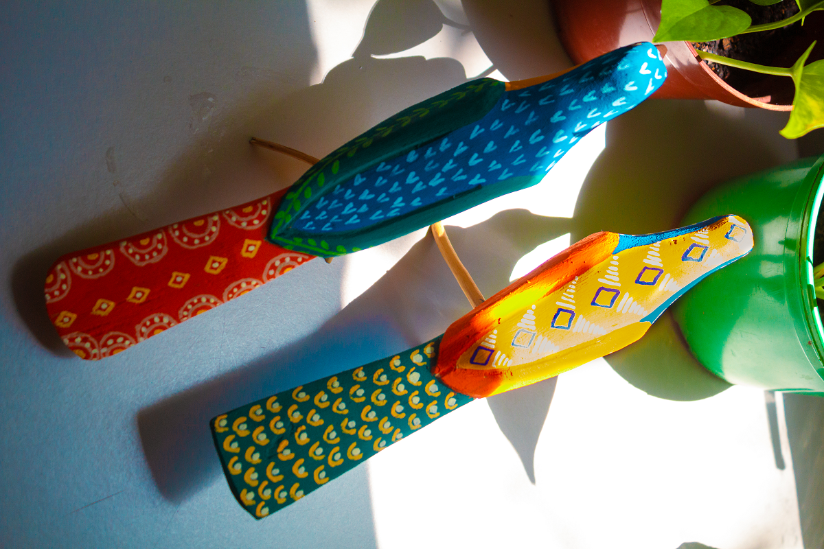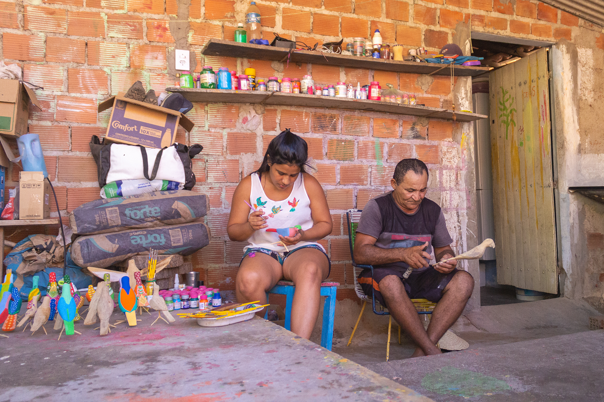 “Antes a gente sempre pintava nas cores tradicionais, aí eu quis pintar diferente, porque eu gosto de pintar do jeito que eu quiser, do meu imaginário. Quando comecei a postar nas redes sociais, o pessoal foi gostando das pinturas e encomendando. Aí foi vindo bastante encomenda, e a gente começou a focar mais nos pássaros”, explica Jamille, de 21 anos, que começou a fazer pinturas para o pai vendo ele trabalhar e se interessando aos poucos pelo ofício de artesã.