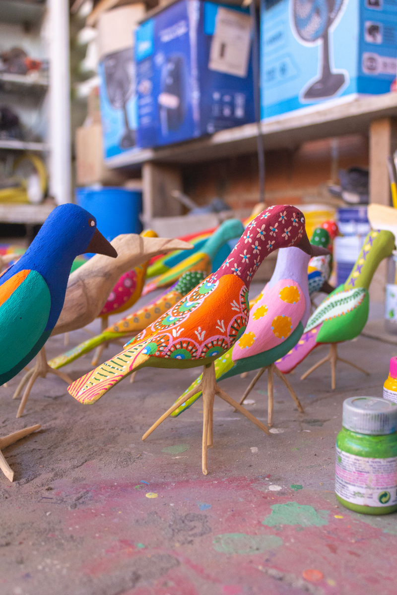 Enquanto Jailton esculpe as peças em madeira, Jamile fica responsável pela pintura dos pássaros, o grande diferencial nas obras dos artistas.
