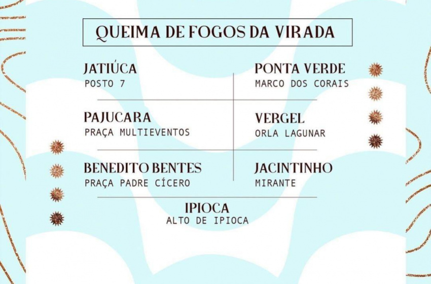 As queimas com 12 minutos de duração vão acontecer no Posto 7, na Jatiúca; Marco dos Corais, na Ponta Verde; Praça Multieventos, na Pajuçara; Orla lagunar, no Vergel; Praça Padre Cícero, no Benedito Bentes; Mirante, no Jacintinho; e no Alto de Ipioca.