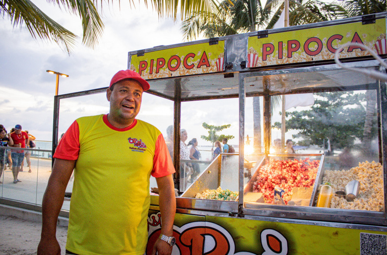 José Clésio é um dos contemplados com as ações do Município na cultura local. Ele precisou dobrar a quantidade de materiais e produtos para poder atender a demanda diária. “Estou vendendo pipoca salgada, chocolates e outros doces e precisei aumentar os pedidos para poder dar conta graças ao movimento diário por aqui. Com aumento nas vendas, pretendo pagar todas as minhas contas e já projeto um passeio com a família”, conta.