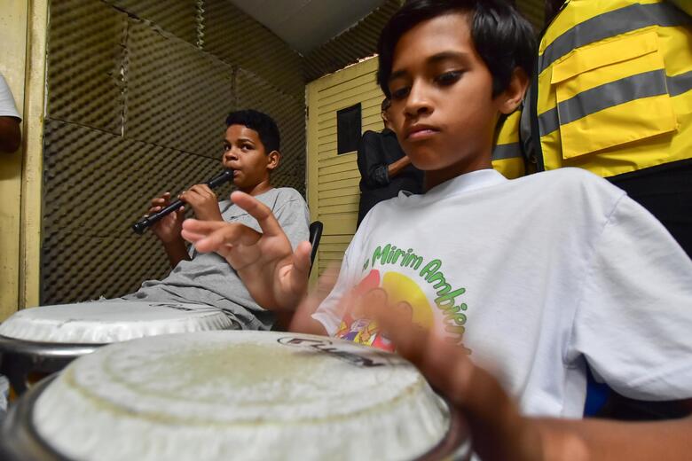 Bongôs, flautas doces, bumbos e violões ofertam a cerca de 20 crianças iniciação musical e uma oportunidade de seguir a carreira futuramente. São dezesseis policiais músicos, egressos das bandas da PM e Forças Armadas, que compartilham suas habilidades, todas as quartas-feiras, a partir das 14 horas, na sede do Ronda.