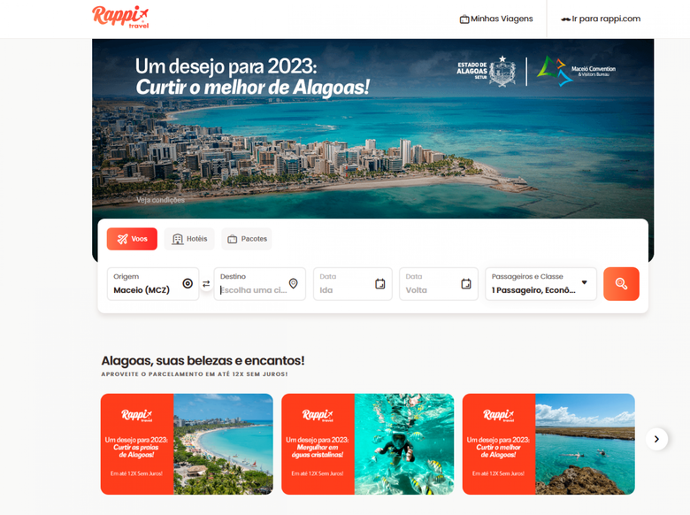 Reprodução do site de vendas da Rappi Travel destinado a Alagoas. Essa é uma das estratégias implementadas pelo Governo de Alagoas para promoção do Destino. Foto: Ascom Setur