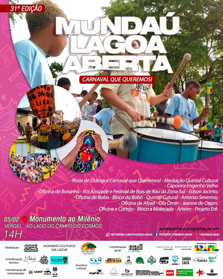 A 31ª edição do Mundaú Lagoa Aberta acontecerá no próximo domingo, 05 de fevereiro, a partir das 14h, no Monumento ao Milênio, Vergel do Lago. O evento terá Roda de diálogo “O Carnaval que queremos!”, com mediação do Quintal Cultural, Oficina de máscaras – Falarte, Oficina de boizinho – Boi Amizade e Festival de Boi de Rau da Zona Sul, Oficina de Bobo – Bloco do Bobo, Oficina de Afoxé – Ofá Omin e Oficina e cortejo do Bloco Molecada – Arteiro Projeto Erê.