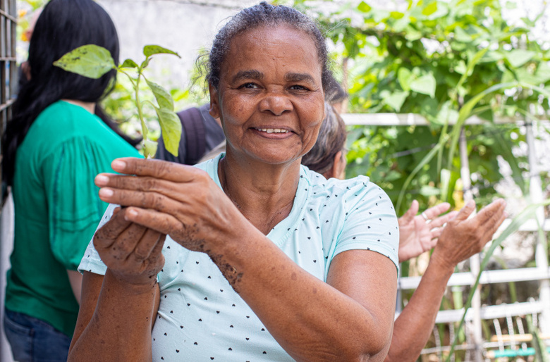 Moradora do bairro do Rio Novo, Tânia Maria, de 58 anos, participou do plantio das mudas. Ela é apaixonada pelos cuidados com plantas e agradece o atendimento recebido no Cras.