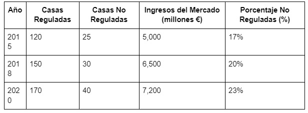 Aquí tienes una tabla que muestra la evolución del mercado de apuestas en España y el impacto de las casas no reguladas: