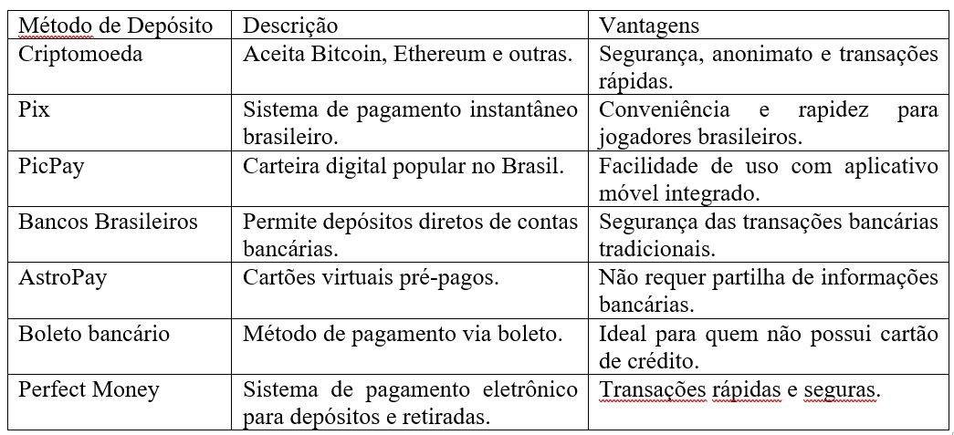 Os jogadores podem fazer depósitos diretamente de suas contas em bancos brasileiros. Essa opção é ideal para aqueles que preferem métodos tradicionais e estão acostumados com o internet banking. Os depósitos são seguros e protegidos pelas medidas de segurança bancária existentes.