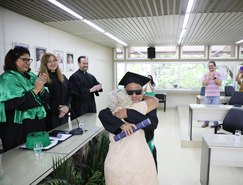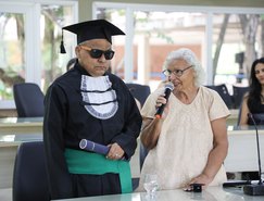 A mãe de Rinaldo, Giselda Maria dos Santos, ficou o tempo todo ao lado do filho, visivelmente emocionada e também muito orgulhosa. “Tenho três filhos e foi justamente o que tem a saúde mais debilitada o único que conseguiu cursar e concluir o ensino superior”, disse ela. Rinaldo agradeceu à mãe, aos demais familiares e a todos os docentes e técnicos da Universidade que contribuíram com os seus estudos. “Eu não chegaria até aqui se não fossem essas pessoas”, concluiu.