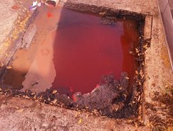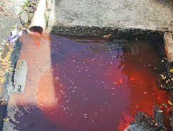 Técnicos da SEDET aplicaram um teste com corante vermelho para verificar a ligação irregular, confirmando o desvio intencional do esgoto — prática comum em casos de tentativa de evitar transbordamento dentro de áreas residenciais.