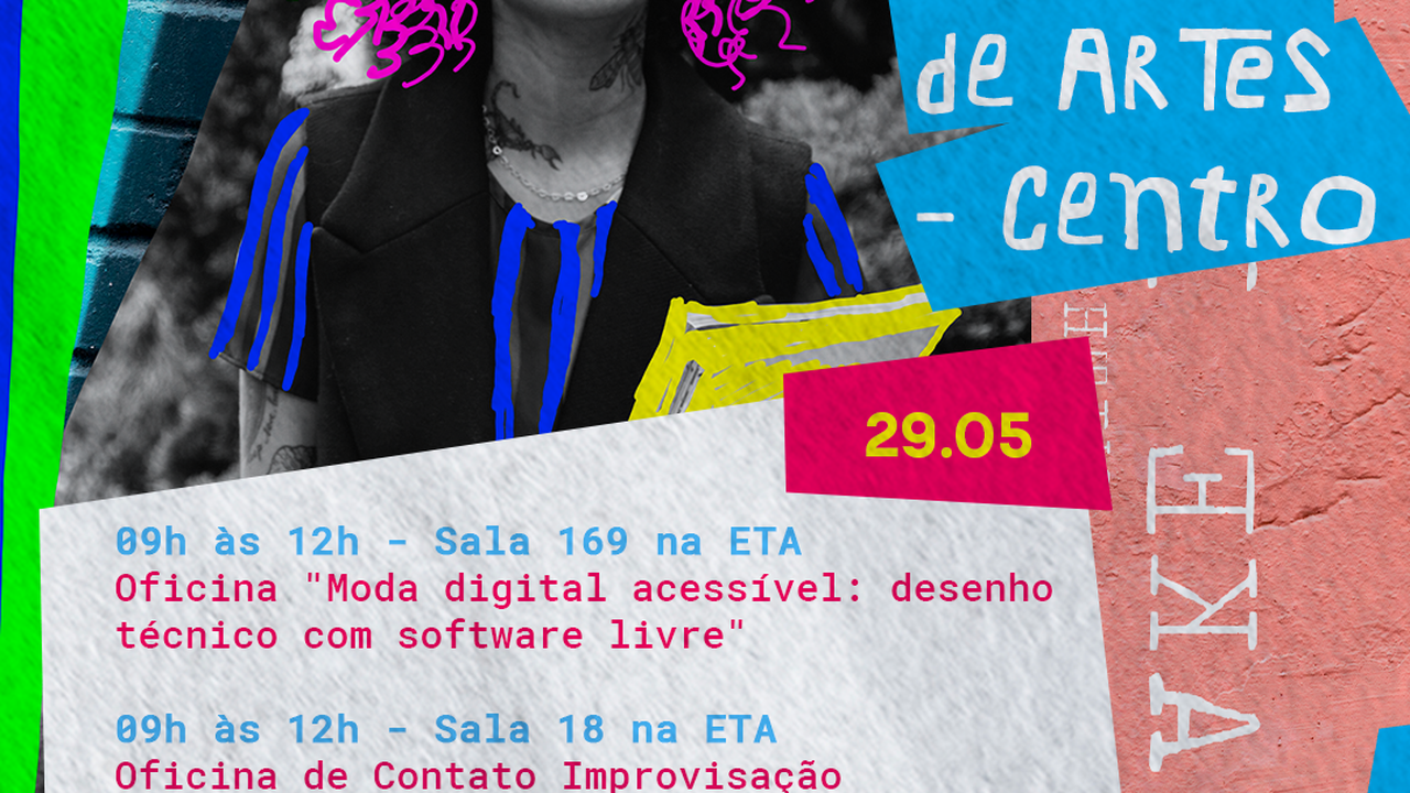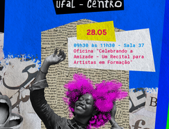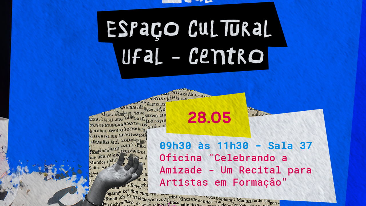 Moda digital acessível – desenho técnico com software livre 29/5 – 9h às 12h | Sala 169, ETA (Centro) Oficineira: Thalita Figueiredo Público: Livre | Capacidade: 12 pessoas | Pré-requisito: Levar celular Contato Improvisação 29/5 – 9h às 12h | Sala 18, ETA (Centro) Oficineiro: Reginaldo Oliveira Público: Livre | Sem pré-requisito Corpo em Jogo – Presença Cênica 29/5 – 14h às 17h | Sala 45, ETA (Centro) Oficineiro: Diogo Dionízio Público: Livre | Sem pré-requisito Celebrando a Amizade – Um Recital para Artistas em Formação 28/5 – 10h às 11h30 | Auditório do Centro Cultural da Ufal (Centro) Com orientação de Reuel Gomes e Melissa Cordeiro, a oficina une apresentação instrumental com vivência aberta ao público.