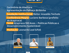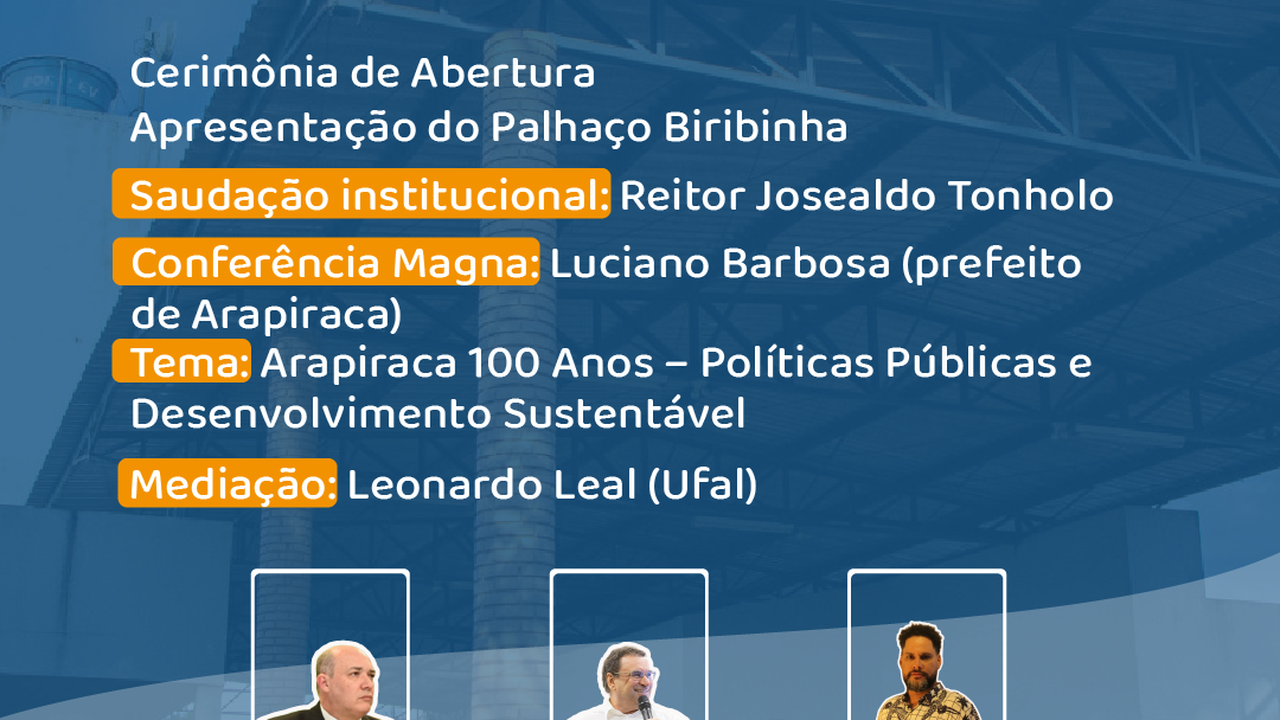 A abertura será na segunda-feira (21/7), com apresentação artística do Palhaço Biribinha (Teófanes Silveira), seguida da saudação do reitor Josealdo Tonholo. A conferência da noite será proferida pelo prefeito de Arapiraca, Luciano Barbosa, com o tema Arapiraca 100 Anos – Políticas Públicas e Desenvolvimento Sustentável, sob mediação do próprio professor Leonardo Leal.