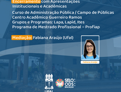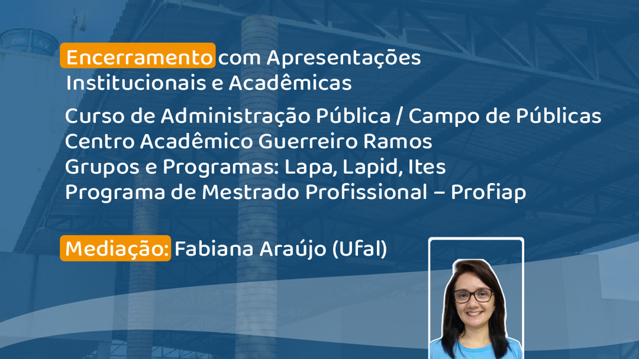 O encerramento, na sexta-feira (25), será dedicado à apresentação de experiências institucionais e acadêmicas, com participação do Curso de Administração Pública, Centro Acadêmico Guerreiro Ramos, Grupos e Programas de Pesquisa (Lapa, Lapid, Ites) e do Programa de Mestrado Profissional em Administração Pública (Profiap).