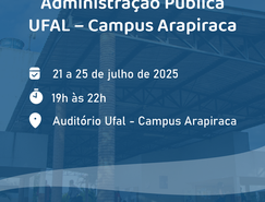 O curso de Administração Pública da Universidade Federal de Alagoas (Ufal) promove na próxima semana, de 21 a 25 (segunda a quarta-feira), o Seminário de Administração Pública, no auditório do Campus Arapiraca.