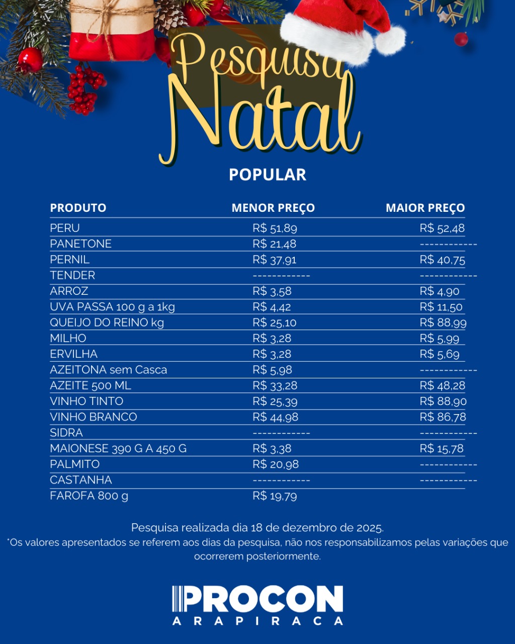 A pesquisa apontou variações de preços entre os estabelecimentos. O peru, por exemplo, apresentou valores a partir de R$ 31,98, podendo chegar a R$ 64,98, a depender do local. Já o panetone foi encontrado com preços entre R$ 14,99 e R$ 37,99.