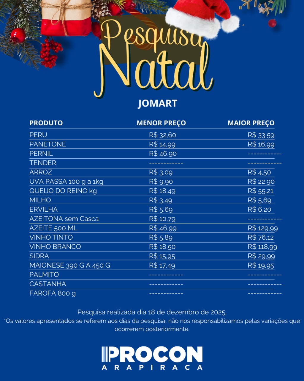 Procon Arapiraca divulga pesquisa de preços de produtos natalinos