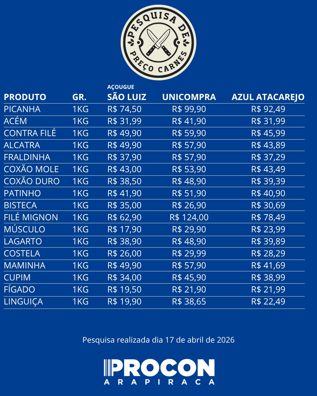 A pesquisa abrange outros 15 cortes de carne bastante procurados pelos consumidores arapiraquenses.