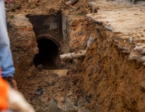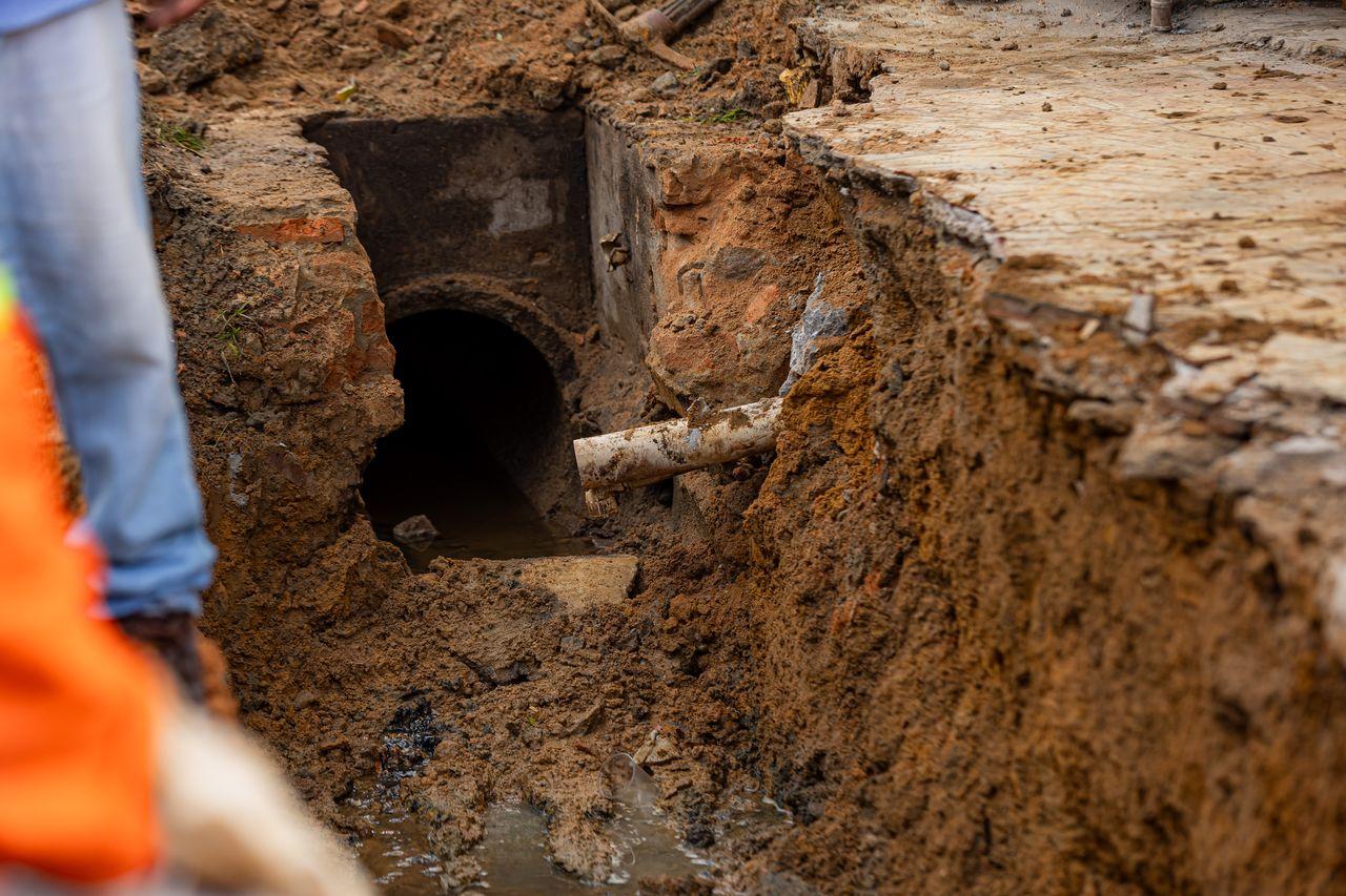 Após escavação na calçada do imóvel, onde o morador havia relatado o problema, a equipe da Seminfra identificou uma ligação clandestina na rede de galeria de águas pluviais, o que levou ao rebaixamento do solo, caracterizando uma irregularidade grave.