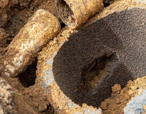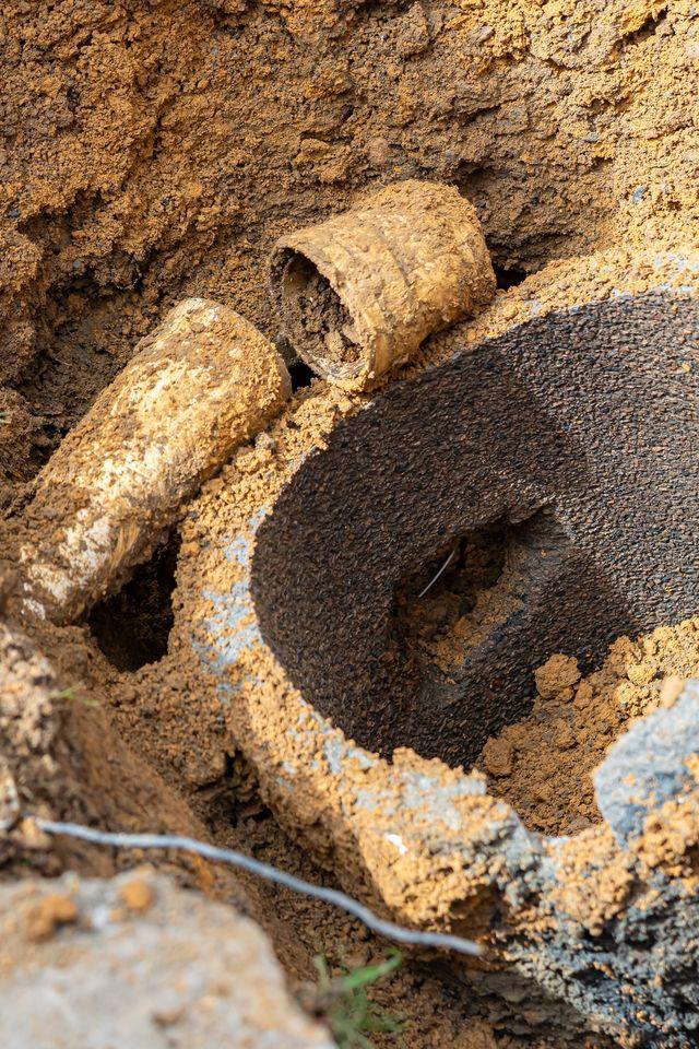 A manilha responsável pela condução da água foi danificada para permitir a ligação clandestina, provocando infiltrações e encharcamento do solo, o que resultou no afundamento da calçada.