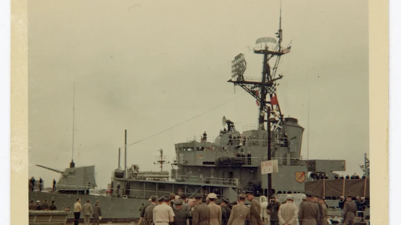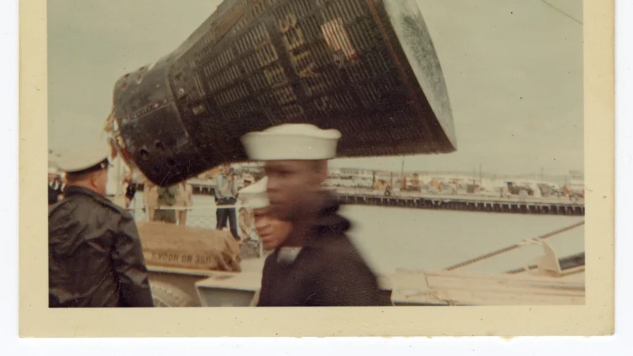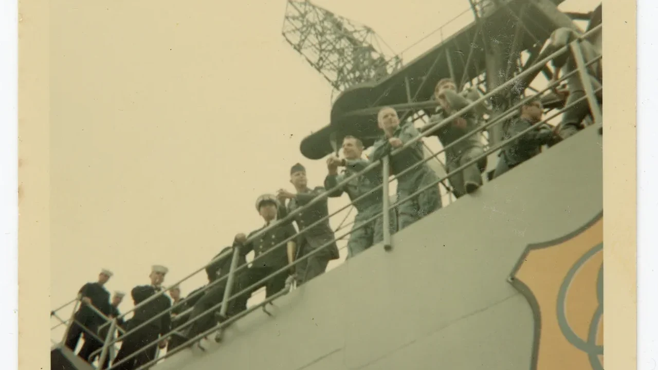A viúva de McQueeney doou as fotos, que mostram Armstrong e Scott no convés de um navio americano. Navio da Marinha e acenando para os membros do serviço em terra. Uma mostra a cápsula Gemini 8 sendo levantada no ar para transporte.
