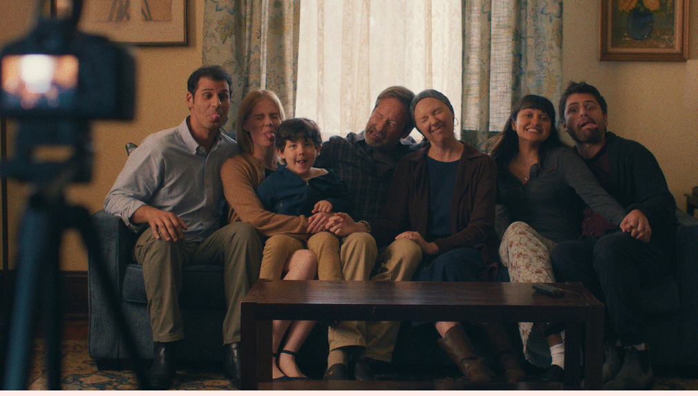 Nesta imagem do filme fornecida pelo Sundance Institute, Skyler Bible, Lucy Boynton, Oliver Diego Silva, David Duchovny, Hope Davis, Ariela Barer e Cooper Raiff aparecem no filme "See You When I See You", de Jay Duplass, seleção oficial do Festival de Cinema de Sundance de 2026. (Jim Frohna/Sundance Institute via AP)