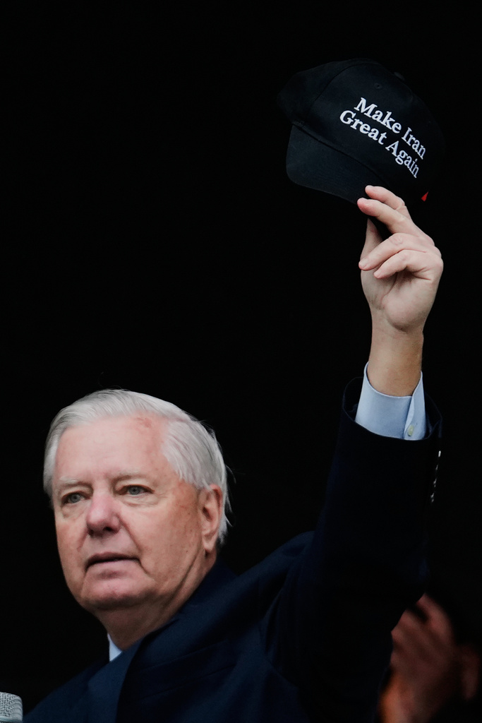 O senador americano Lindsey Graham, da Carolina do Sul, acena para os apoiadores do príncipe herdeiro iraniano exilado Reza Pahlavi em uma manifestação durante a Conferência de Segurança de Munique, na Alemanha, no sábado, 14 de fevereiro de 2026. (Foto AP/Ebrahim Noroozi)