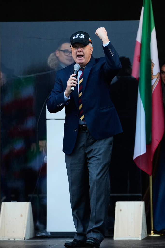 O senador americano Lindsey Graham, da Carolina do Sul, discursa para apoiadores do príncipe herdeiro iraniano exilado Reza Pahlavi em uma manifestação durante a Conferência de Segurança de Munique, na Alemanha, no sábado, 14 de fevereiro de 2026. (Foto AP/Ebrahim Noroozi)