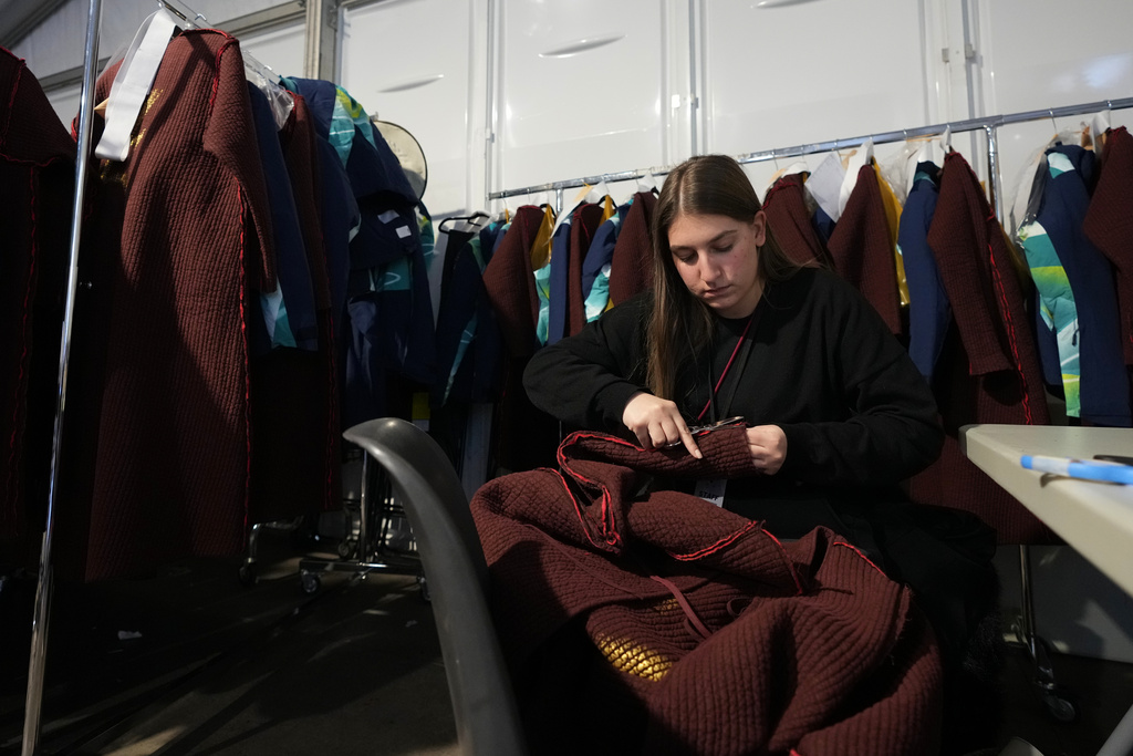 A costureira Luciana Donadio trabalha em um camarim do lado de fora da Arena antes da cerimônia de encerramento dos Jogos Olímpicos de Inverno de 2026, em Verona, Itália, na terça-feira, 17 de fevereiro de 2026. (Foto AP/Antonio Calanni)