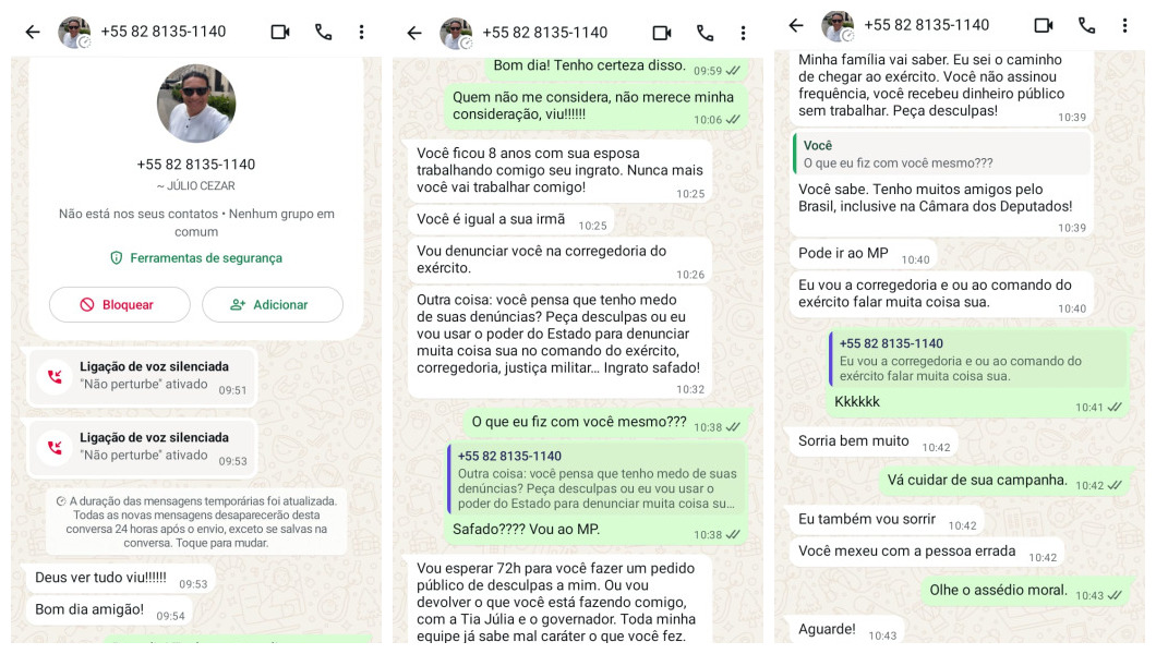 “Peça desculpas ou eu vou usar o poder do Estado para denunciar muita coisa sua no comando do Exército, corregedoria, justiça militar... Ingrato safado!”, escreveu Júlio Cezar.