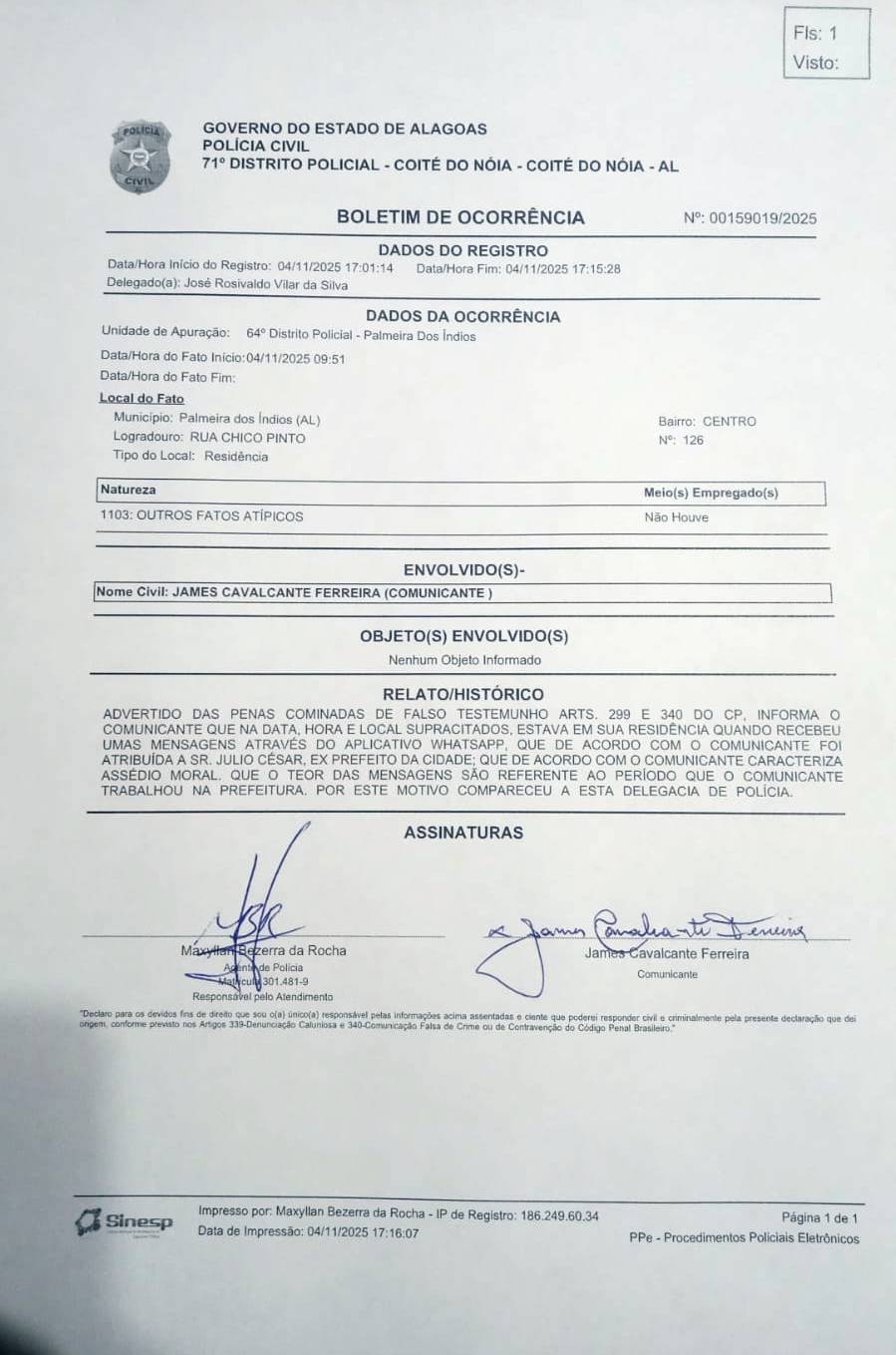 A queixa foi formalizada ontem (terça-feira (4), no CISP de Palmeira dos Índios, sob o número BO 00159019/2025, e aponta o uso do poder político e institucional do Estado para intimidar e ameaçar o militar, por meio de uma série de mensagens trocadas via WhatsApp, já reconhecidas em ata notarial assinada pela tabeliã Leonela Otília Sauter Soares.