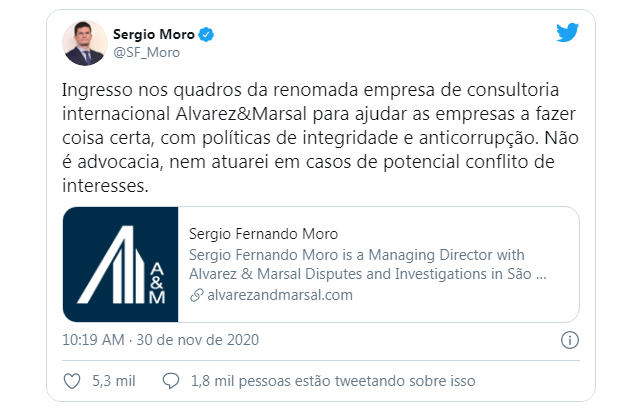 “A contratação de Moro está alinhada com o compromisso estratégico da A&M em desenvolver soluções para as complexas questões de disputas e investigações, oferecendo aos clientes da consultoria e seus próprios consultores a expertise de um ex-funcionário do governo brasileiro”, justificou o escritório em comunicado.