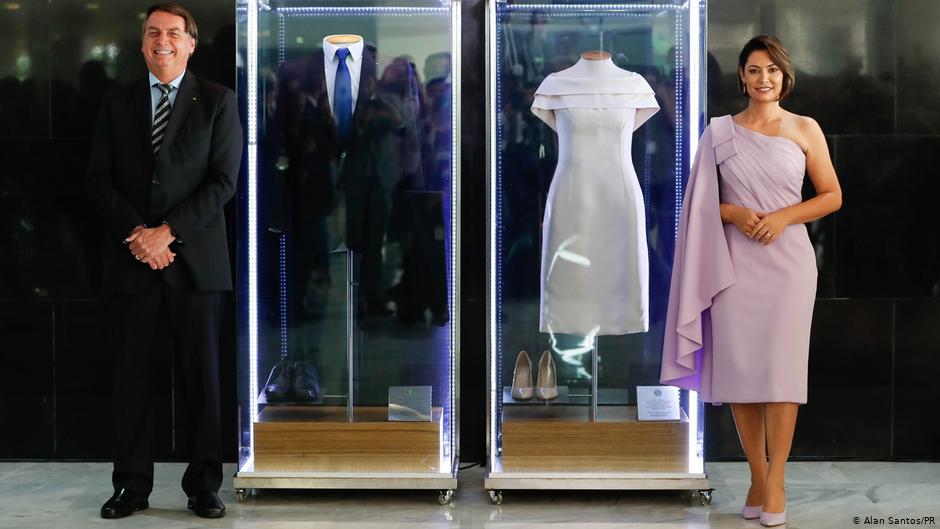 Bolsonaro e Michelle inauguram exposição de roupas da posse em meio à pandemia. Ela voltou ao foco do caso Queiroz após a revelação de depósitos