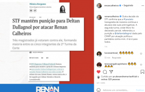 Em publicação nas suas redes sociais, o senador Renan Calheiros comemorou a decisão da segunda turma do Supremo Tribunal Federal (STF) que formou maioria para manter a pena aplicada ao procurador Deltan Dallagnol pelo Conselho Nacional do Ministério Público (CNPM). Renan representou o procurador por entender que ele agiu de forma política ao publicar o seguinte tuíte em 2019 que: