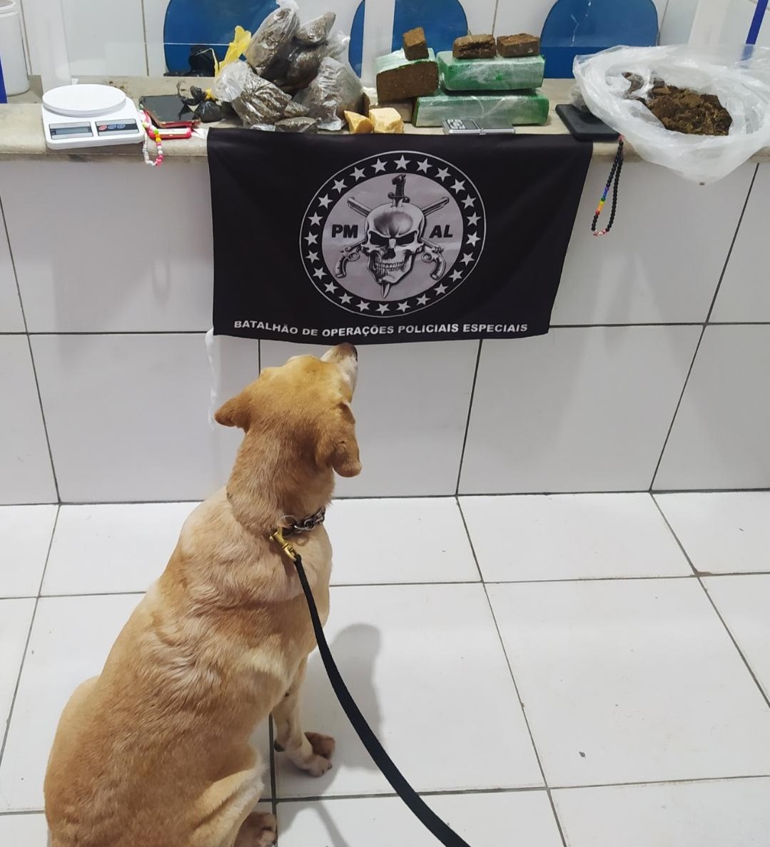 Ao chegarem ao local, os militares avistaram um indivíduo em atitude suspeita adentrando no imóvel, que já contava com a presença de outra pessoa. Da porta, as equipes avistaram dois tabletes de maconha e uma balança de precisão em cima da mesa. Com ajuda do cão farejador, os policiais encontraram mais drogas dentro de um frigobar, totalizando 3.100 gramas de maconha, 160 gramas de crack, duas balanças de precisão, um celular e R$ 58,00.