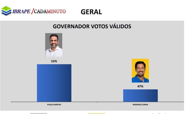 O governador Paulo Dantas (MDB) seria reeleito neste domingo de acordo com a pesquisa do Ibrape/Cada Minuto divulgada neste sábado (29). Paulo está com 53% da intenção de votos totais. Essa é mais uma pesquisa que refoça a consolidação do nome do governador na reta final da campanha. Rodrigo Cunha aparece com 47% dos votos. O Ibrape foi a pesquisa que mais se aproximou do resultado no primeiro turno. A pesquisa entrevistou 1.992 pessoas de 56 municípios.
