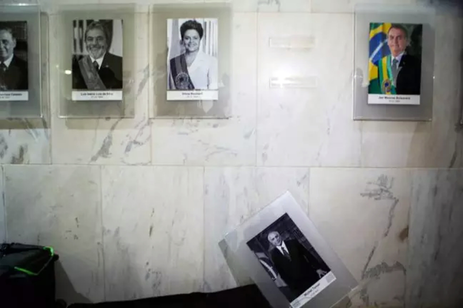 A foto, em preto e branco, está na Galeria dos Presidentes, no saguão principal do Planalto. Naquele espaço, Temer fica entre Dilma Rousseff – que sofreu impeachment em 2016 e foi substituída por ele, à época vice – e Jair Bolsonaro. Dilma é a única mulher da galeria onde só Bolsonaro tem a fisionomia colorida porque ainda está no exercício do mandato.