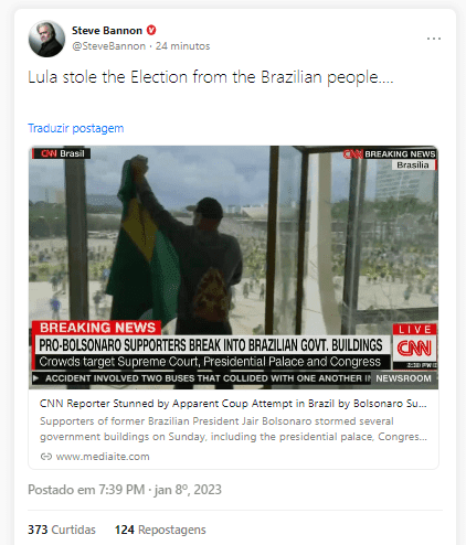 O estrategista de extrema direita americano Steve Bannon e outros nomes influentes nos Estados Unidos comentaram e comemoraram a invasão do Congresso, do Supremo Tribunal Federal (STF) e do Palácio da Alvorada por bolsonaristas insatisfeitos com os resultados das eleições, ontem (08). Para isso, continuaram espalhando fake news sobre fraude nas urnas eletrônicas.