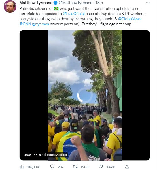 Além de ter feito e republicado diversos tuítes sobre a invasão de ontem, Matthew Tyrmand também participou de um Spaces — sala de áudio no Twitter — para debater os atos, junto a Allan dos Santos, blogueiro bolsonarista que se encontra foragido da Justiça nos Estados Unidos.