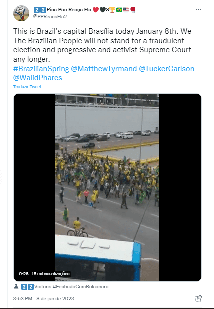 “Esta é a capital do Brasil, Brasília, hoje, 8 de janeiro. Nós, o povo brasileiro, não vamos mais aceitar uma eleição fraudulenta e um Supremo Tribunal progressista e ativista. #PrimaveraBrasileira”, afirmou em inglês o conteúdo mais retuitado com o termo no dia 8 de janeiro.