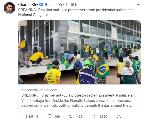 O site canadense The Post Millennial, de orientação conservadora, também publicou sobre as invasões aos prédios públicos brasileiros. O texto foi compartilhado no Twitter por Charlie Kirk, CEO do Turning Point USA – evento anual para a juventude de direita que recebeu Eduardo Bolsonaro como palestrante em junho deste ano – e por Jack Posobiec, comentarista frequente no War Room, editor sênior do site conservador Human Events, e responsável por divulgar teorias da conspiração.
