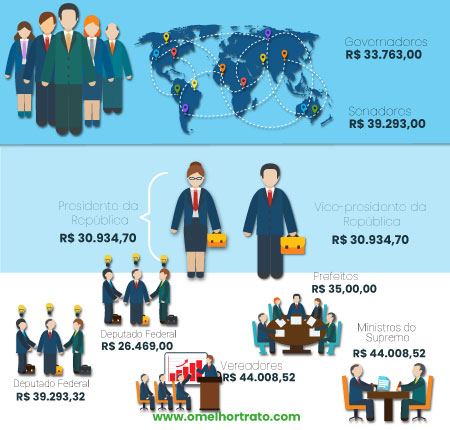 Vereadores: O valor pode variar conforme o salário de um deputado estadual e do tamanho do município onde ele foi eleito; o salário varia entre R $5 mil e R $21 mil reais mensais. Além dos valores salariais, os vereadores também estão aptos a receberem uma remuneração extra de acordo com benefícios políticos;