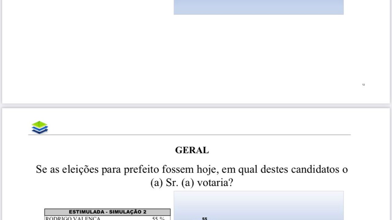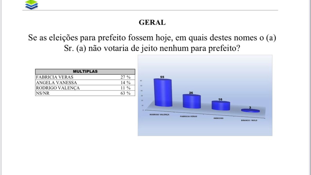 Em um cenário onde candidato a prefeito seria o ex-prefeito e suplente de deputado federal, Rodrigo Valença , a vantagem também é grande com 55% dos votos, mais que o dobro dos votos da oposição que pontua 26%.