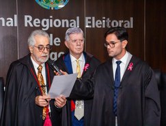 Na manhã desta sexta-feira (17), o Tribunal Regional Eleitoral de Alagoas (TRE/AL) entregou a Medalha do Mérito Eleitoral Desembargador Hermann Byron de Araújo Soares, maior honraria do Tribunal, ao delegado Flávio Saraiva - secretário do Estado da Segurança Pública, ao comandante-geral da Polícia Militar de Alagoas (PM/AL), coronel Paulo Amorim Feitosa e ao desembargador Carlos Eduardo Contar, presidente do TRE do Mato Grosso do Sul e do Colégio de Presidentes dos Tribunais Regionais Eleitorais (Coptrel).