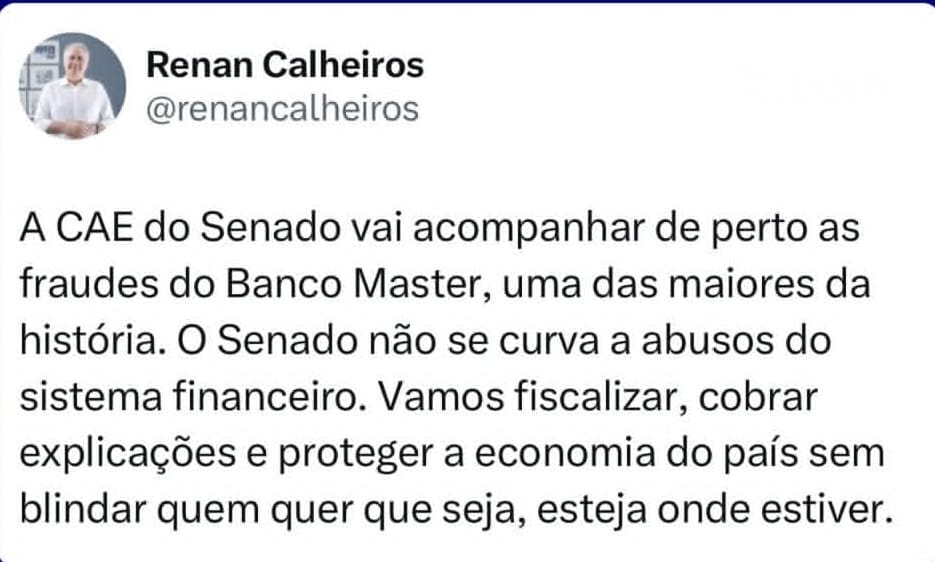 Na postagem, Renan reforçou que o Senado não pretende se omitir diante do episódio: “O Senado não se curva a abusos do sistema financeiro. Vamos fiscalizar, cobrar explicações e proteger a economia do país sem blindar quem quer que seja, esteja onde estiver.”
