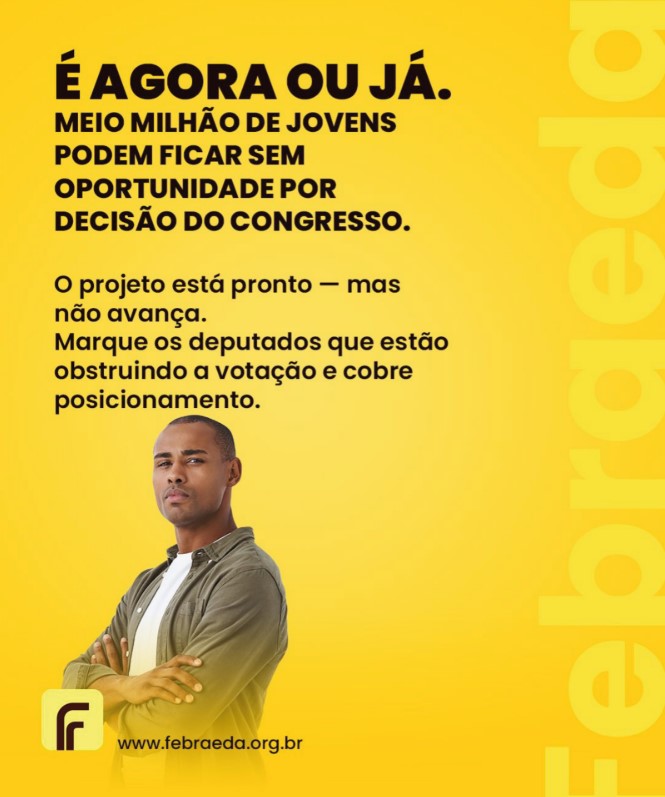 Dentro deste cenário, a Febraeda irá iniciar uma campanha nas redes sociais visando conscientizar nossos parlamentares sobre o que é a Aprendizagem Profissional enquanto política pública preventiva, intersetorial, com reflexos claros no Trabalho, na Educação e na Assistência Social, para que sejam retiradas essas emendas apresentadas, por parte de alguns deputados federais, e que resultariam na perda de 500 mil vagas para nossa juventude no Brasil.