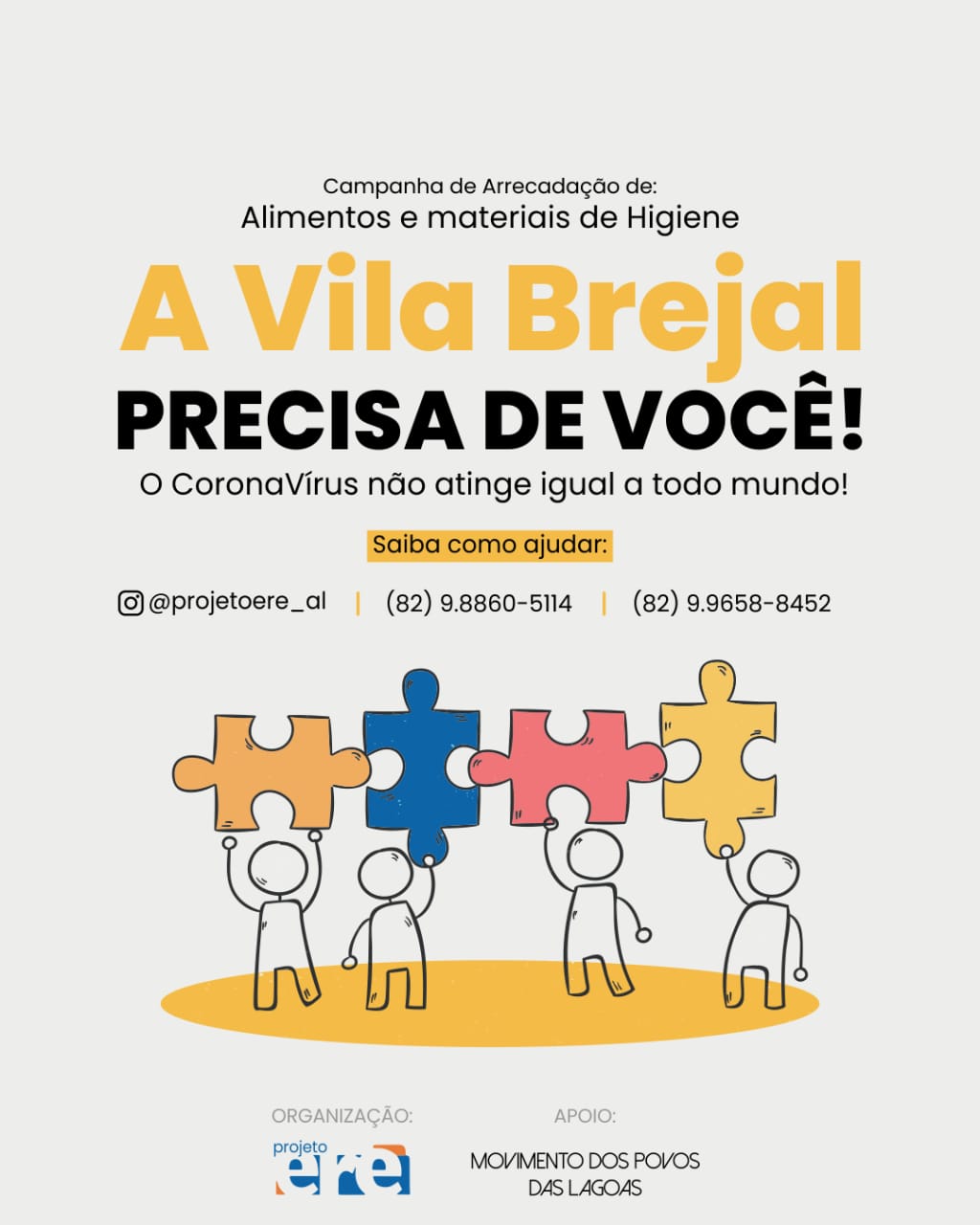 O Projeto Erê está realizando uma campanha para arrecadação de matérias em prol dos moradores da Vila Brejal e demais comunidades da Zona Sul que estão com dificuldades para o enfrentar a pandemia do novo coronavírus (Covid-19), que os deixam sem alimentos, trabalho,material de limpeza e higiene e a ausência de saneamento básico nas casas, ruas e bairros.