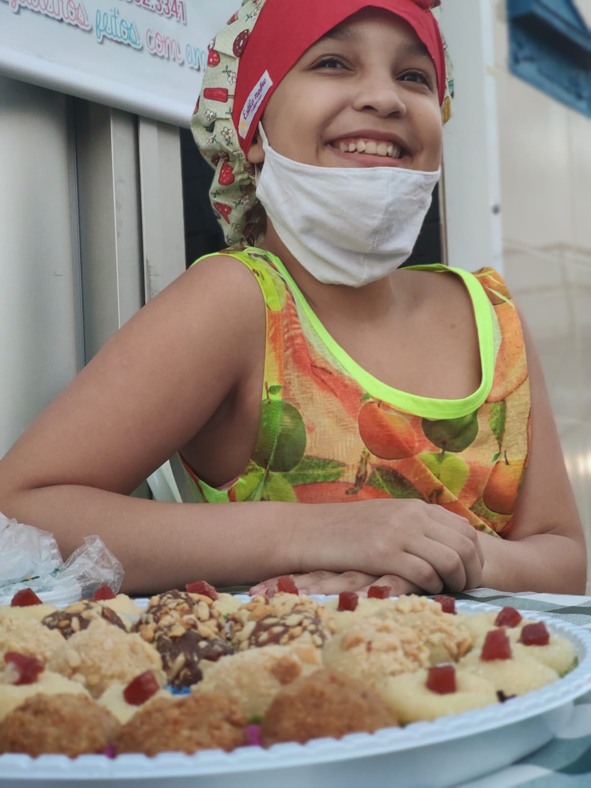 Ela faz os brigadeiros com a ajuda da avó que manuseia as panelas no fogo e por volta das 17h começa a montar sua “barraquinha” na porta de casa. Seu uniforme é avental, gorro de confeiteiro e uma alegria que contagia a todos. A família tem se revezado para ficar sempre um adulto acompanhando as vendas e ela que oferece para as pessoas que transitam, conversa, fala dos sabores e agradece com um grande sorriso no rosto, empolgação e determinação de uma menina que quer realizar o sonho de ser uma grande tecladista.