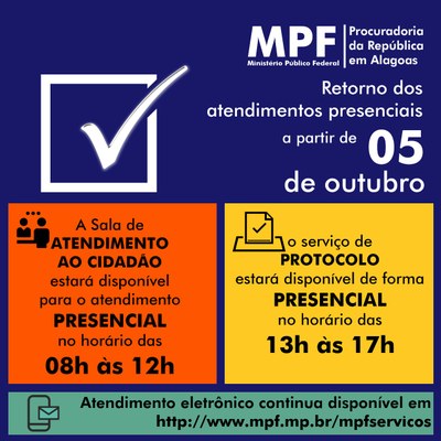 A Sala de Atendimento ao Cidadão estará disponível para o atendimento presencial no horário das 08h00 às 12h00, já o serviço de protocolo das 13h00 às 17h00. Em caso de dúvidas, o cidadão pode ligar para (82) 2121-1468. Acesse aqui a Portaria MPF/PRAL nº 31, de 25 de setembro de 2020, que detalha os procedimentos.