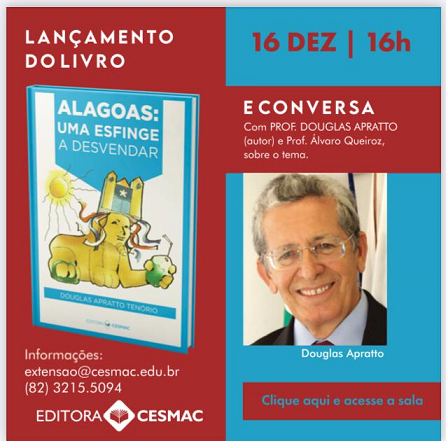 O lançamento acontece no próximo dia 16, às 16h, na sala virtual de Extensão do Cesmac. A obra Intitulada “Alagoas: uma esfinge a desvendar”, de autoria do historiador e vice-reitor do Cesmac, Prof. Dr. Douglas Apratto Tenório, está sendo publicada pela Editora Cesmac. A iniciativa, organizada e concluída em 1982, oferece uma mostra panorâmica de Alagoas, com as contradições e impasses.
